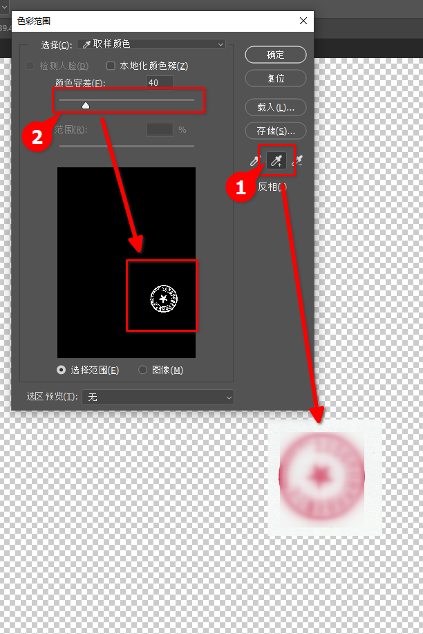 3. 在色彩范围中,点击吸管,吸取印章颜色