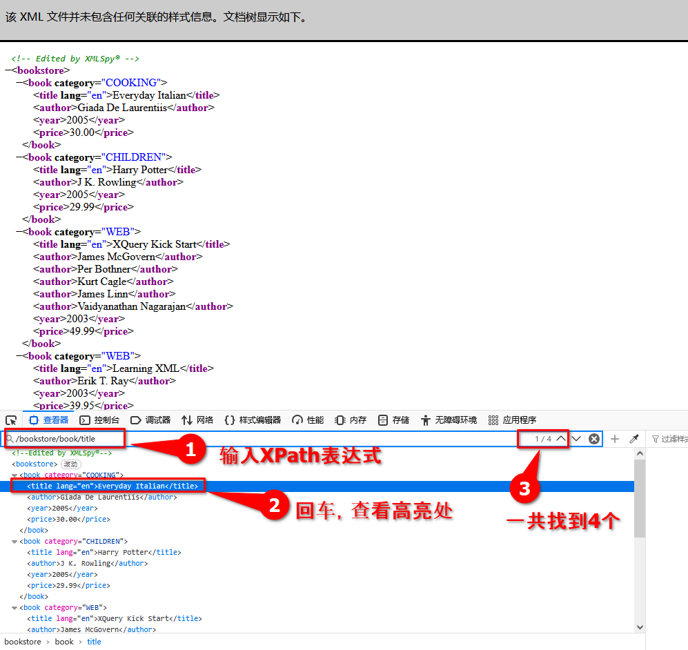 在搜索框中输入 /bookstore/book/title 选取所有 title 节点