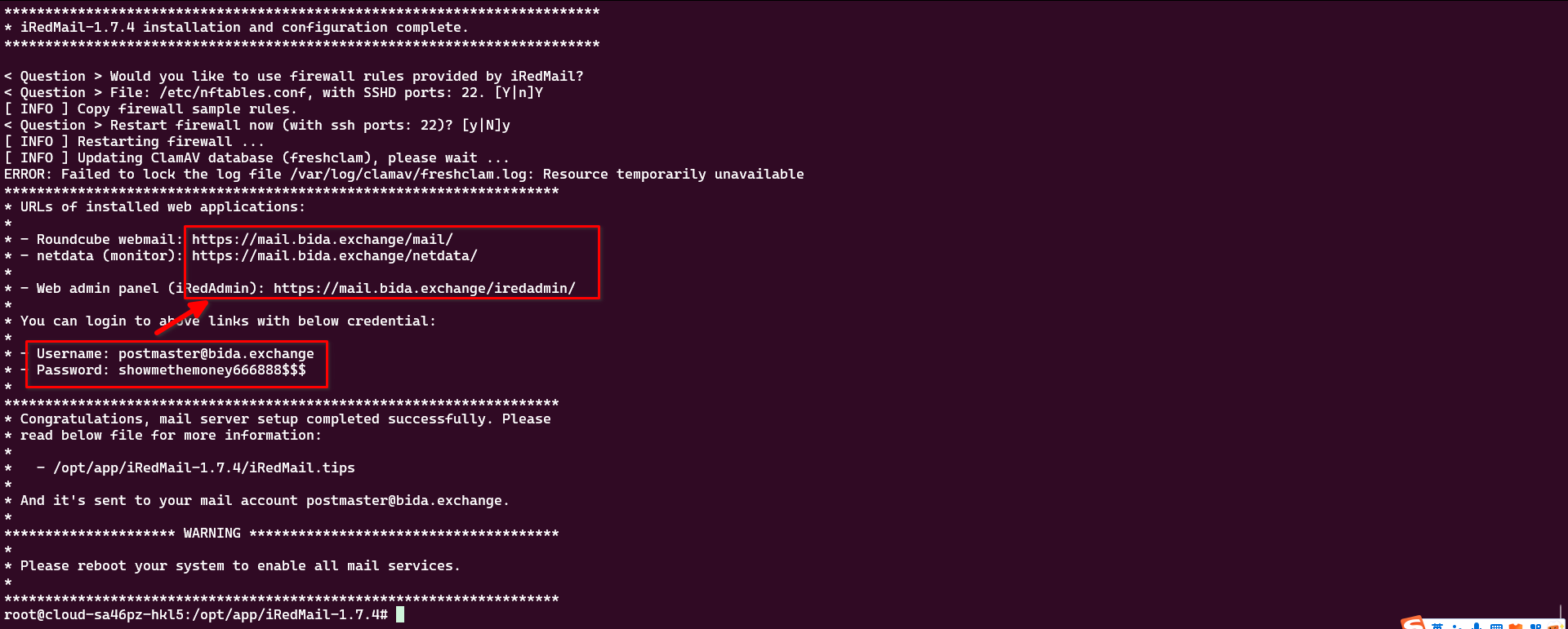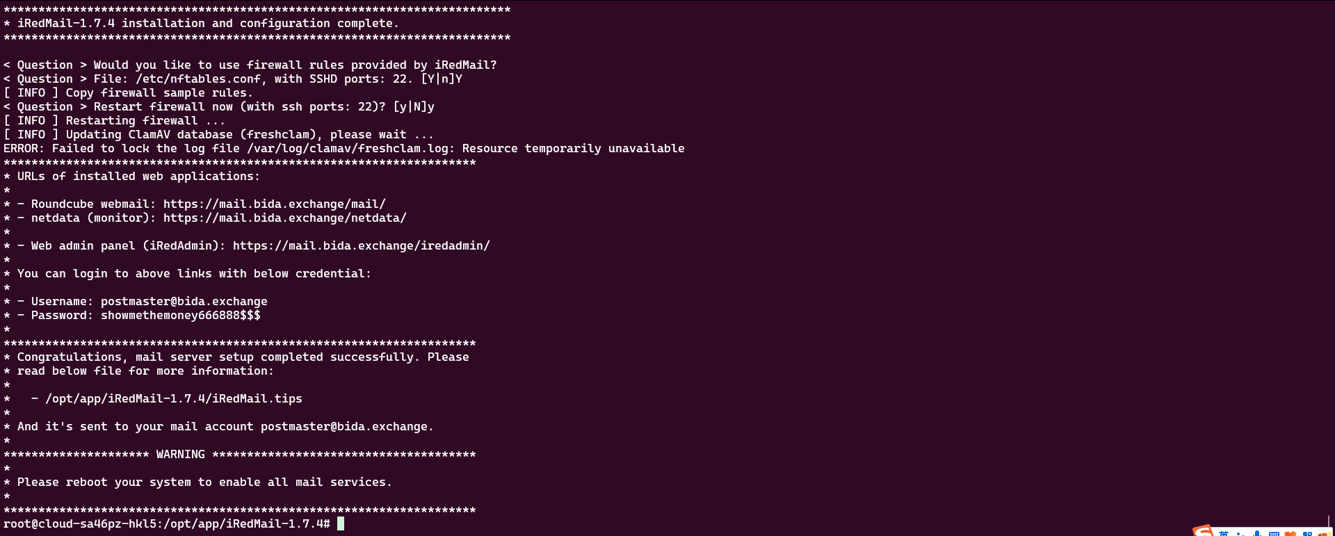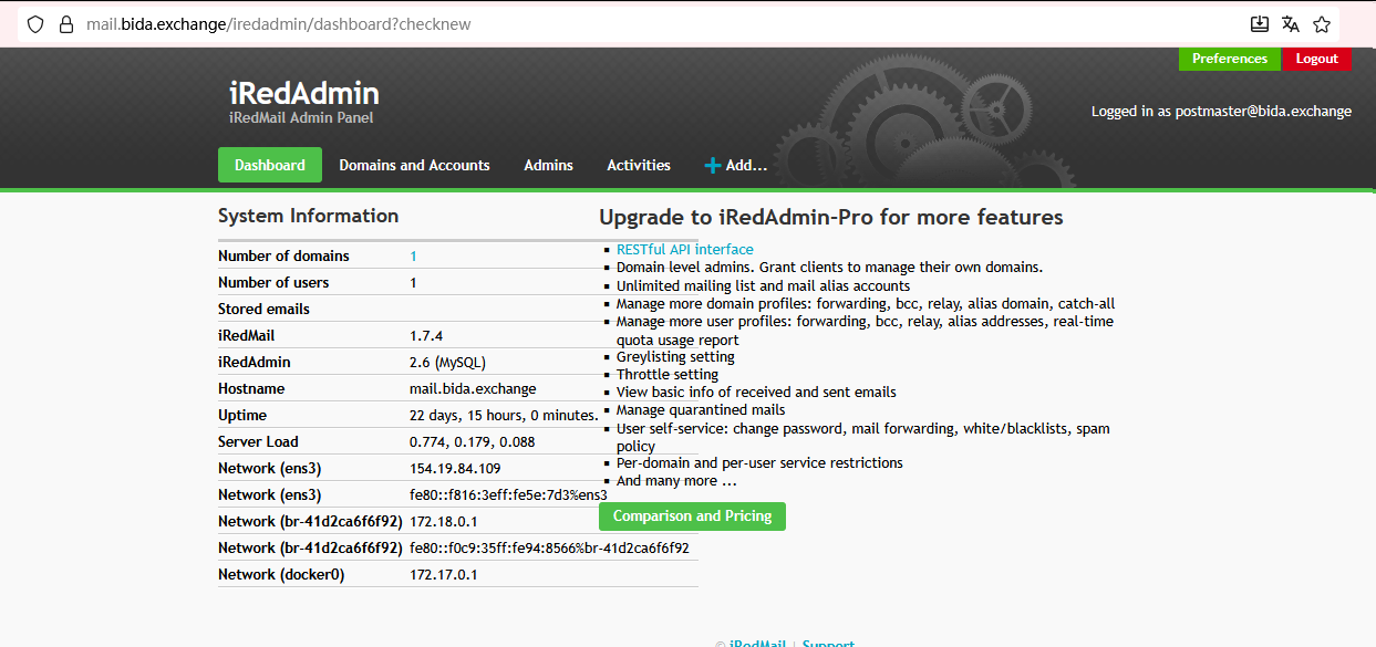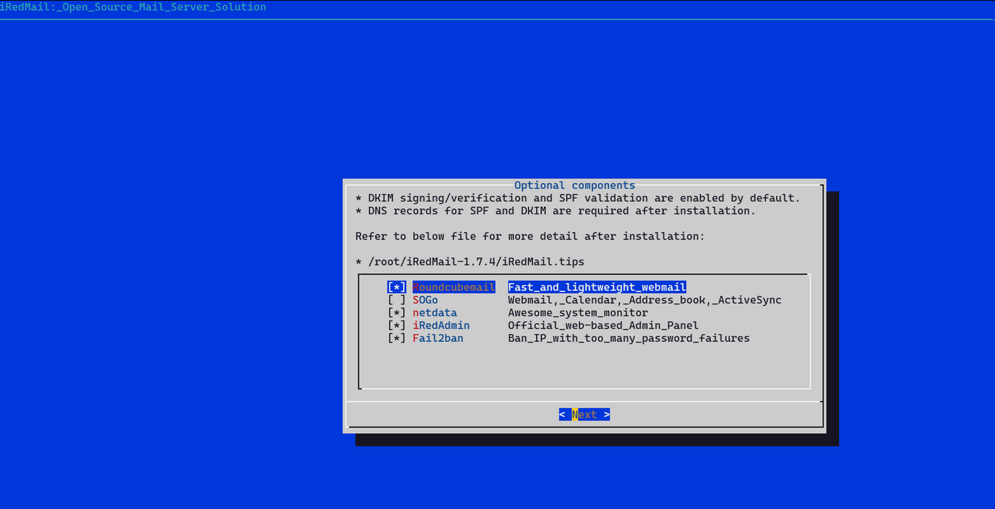 * Additional components:                Roundcubemail netdata iRedAdmin Fail2ban