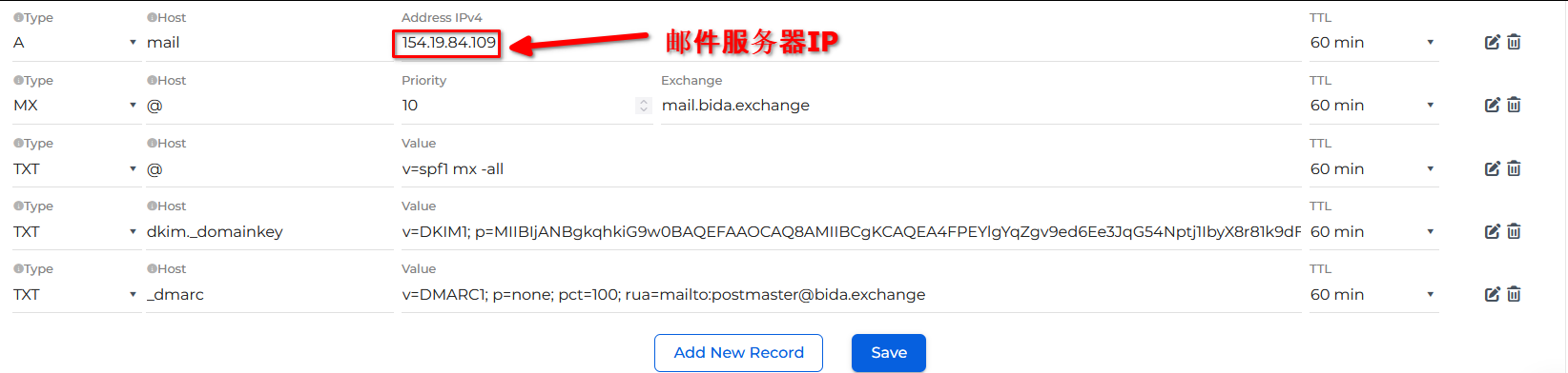 6.3 还需要增加一些其他的记录,设置域名的 MX记录,A记录和TXT记录,内容如下一共5个: