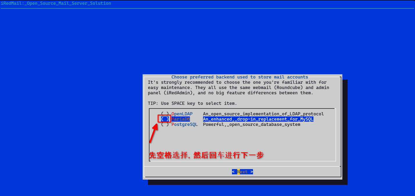 下一步.默认open ldap页面,选择maria DB (见上面的原文链接):
