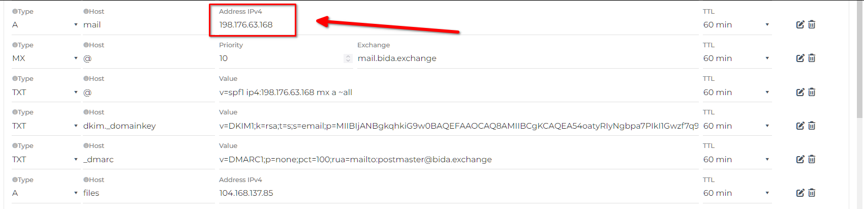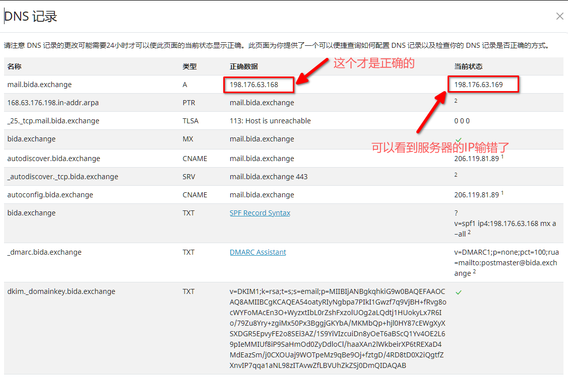 打开 mailcow 找到域名的配置,在里面查看 DNS 记录,可以看到第一个 A 类型存在问题