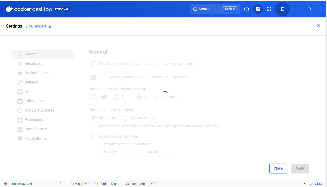 dokcer engine 正在初始化:第一张图左下角显示 Engine starting,就表示 docker 服务还没有完全启动,界面就一直处于加载状态
