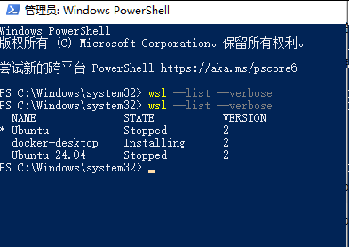 可以看到返回的内容 docker-desktop 的状态是 Installng(安装中)